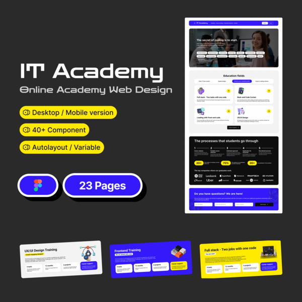 Online Academy Web Design Template is a responsive EdTech UI kit with 23 screens (mobile 393x852 & desktop 1512x892), featuring a modern design system including a full color palette, typography styles (H1βH6, body, captions, buttons), and reusable UI components for seamless online learning experiences.