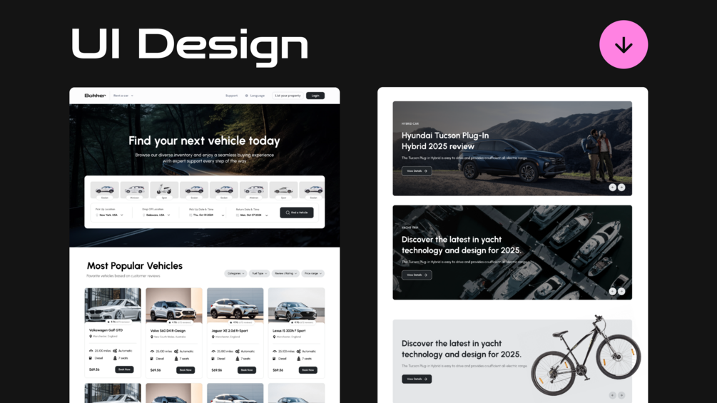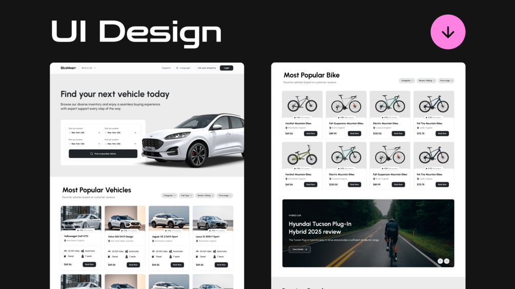 Rent a Vehicle – Booking Web Design Template is a clean and minimal web UI kit crafted for a seamless car rental experience. Designed in a minimalist style, the template includes 4 responsive screens at 1440x1024 px. The layout emphasizes clarity and simplicity with spacious composition, modern typography, and a neutral color palette.
